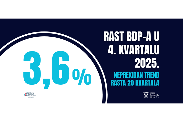 Državni zavod za statistiku (DZS) objavio je petak prvu procjenu, prema kojoj je bruto domaći proizvod (BDP) u četvrtom tromjesečju prošle godine realno porastao za 3,6 posto u odnosu na isto razdoblje godinu dana prije.